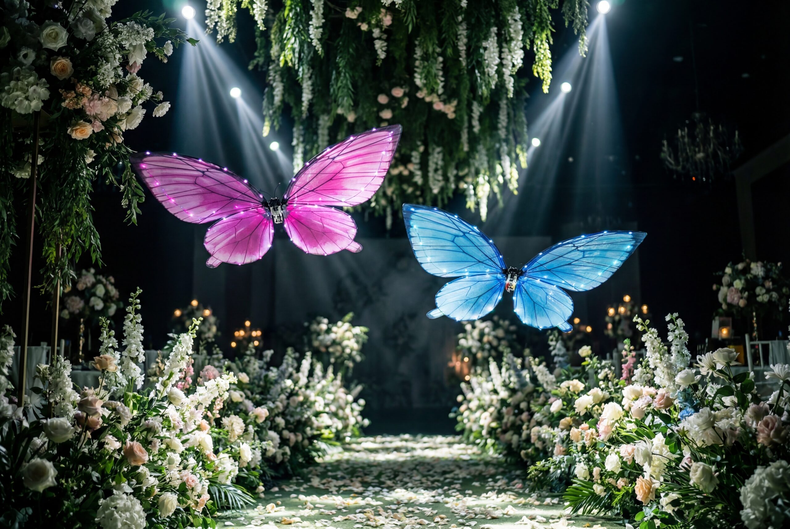 Với không gian rộng và ánh sáng ban đêm, drone bướm lễ cưới hoặc drone bướm sự kiện ngoài trời mang lại hiệu ứng bay mềm mại, tạo cảm giác lãng mạn và sang trọng.