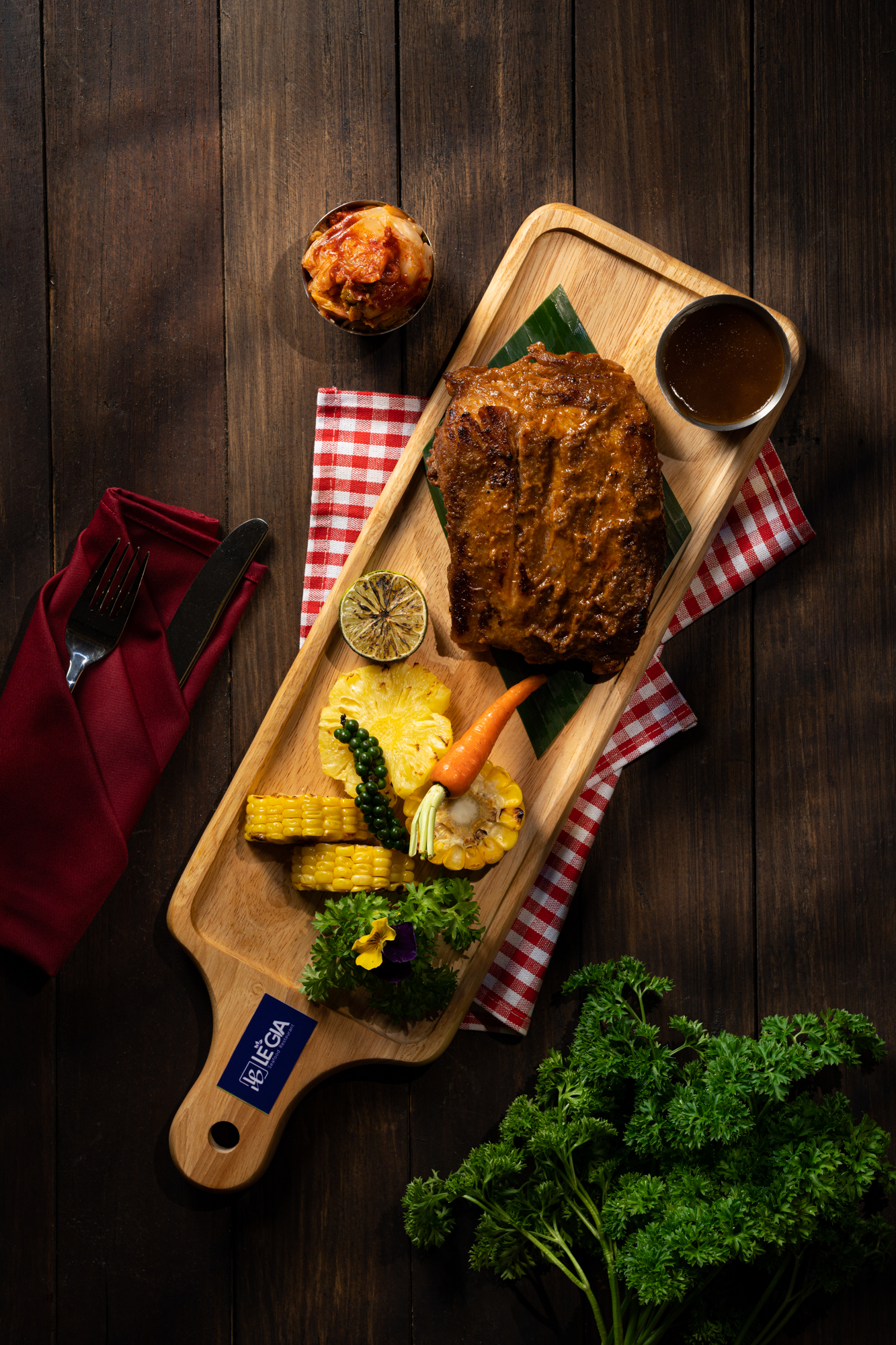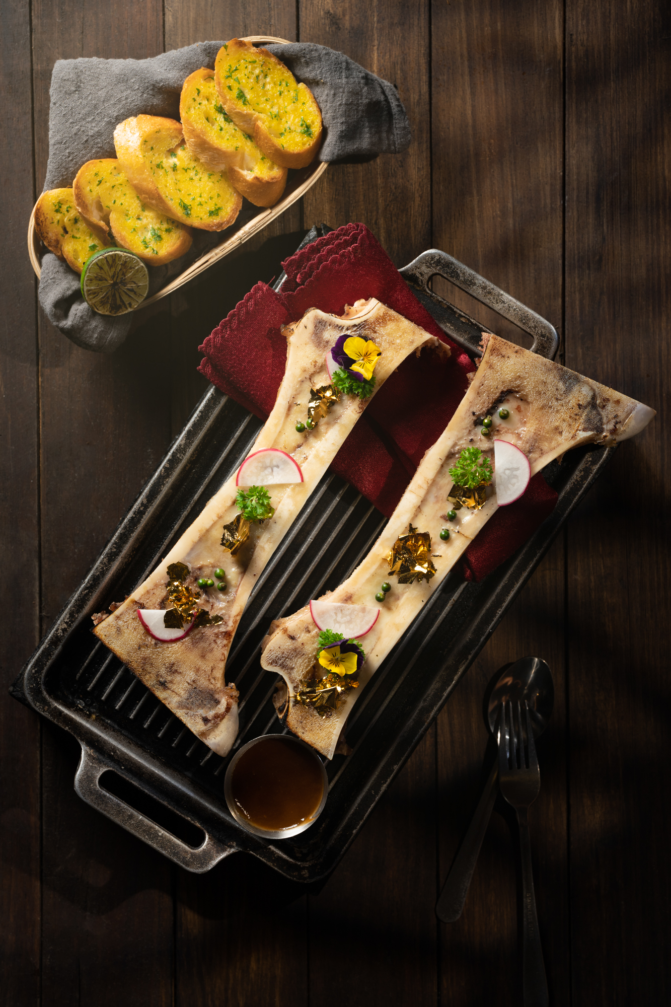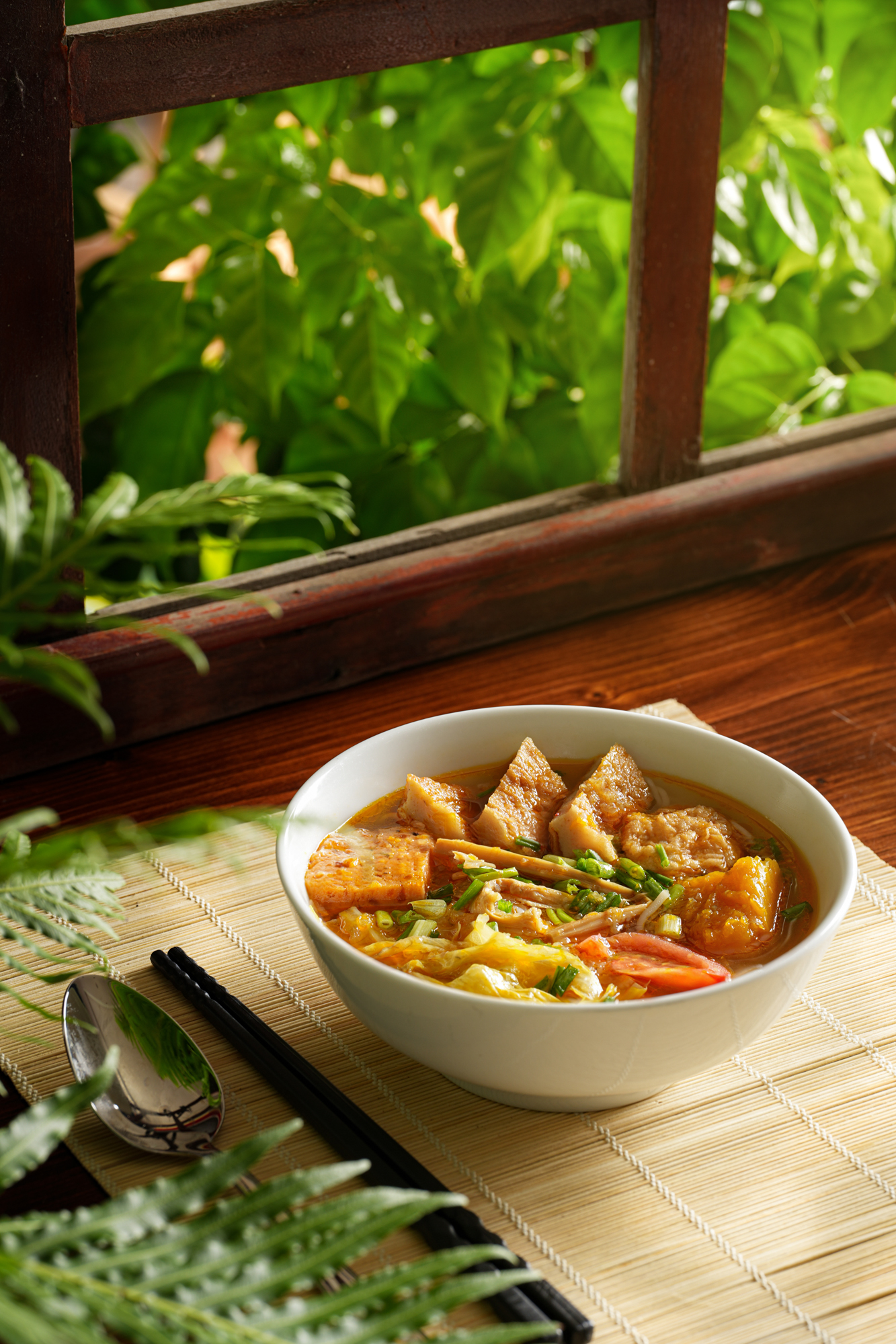 Background và đạo cụ được chọn lọc kỹ để hỗ trợ món ăn mà không gây rối mắt, đồng thời bố cục được sắp xếp để làm nổi bật chủ thể chính.